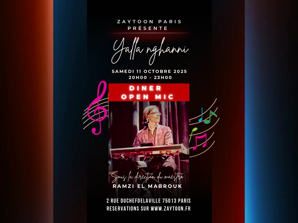 ¡Una nueva edición de nuestras noches de Open Mic, bajo la dirección del Maestro Ramzi El Mabrouk, para una actuación en vivo única!Menú del espectáculo que incluye una selección de mezzes fríos, mezzes calientes, platos a la parrilla y postre- ¿Cuándo? Sábado 11 de octubre de 2025, de 20:30 a 23:00.- ¿Dónde? Zaytoon, 2 rue duchefdelaville 75013 París